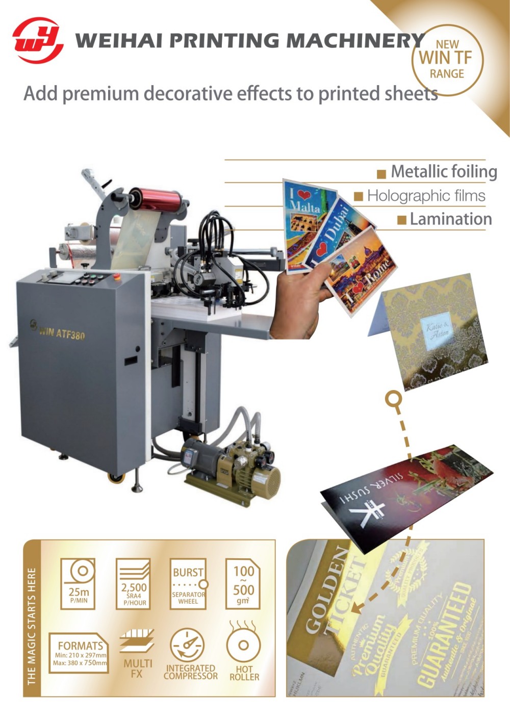 Η πρέσα πλαστικοποίησης και φύλλωσης με τροφοδοσία φύλλων 380 mm είναι ικανή να σφραγίζει αυτόματα μεταλλικά και έγχρωμα σχέδια χωρίς παραδοσιακές πλάκες θερμής σφράγισης. Είναι κατάλληλο όχι μόνο για βραχυχρόνιες ψηφιακές εφαρμογές κατ' απαίτηση αλλά και για παραδοσιακές λιθογραφικές εξόδους offset. Χρησιμοποιεί ολογραφικές μεμβράνες για να δημιουργεί αυτόματα μοτίβα με κουκκίδες και κυματισμούς νερού, κάνοντας τα τυπωμένα υλικά ακόμα πιο εκλεκτά.